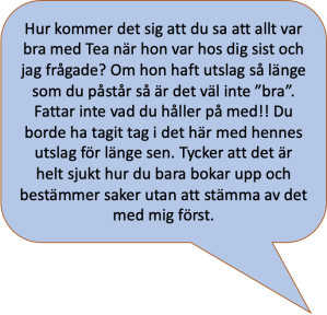 Tea är 8 år och bor växelvis hos sina föräldrar som har delad vårdnad. Orange pratbubbla symboliserar den icke narcissistiska förälderns sms och den blå pratbubblan den narcissistiska förälderns sms.