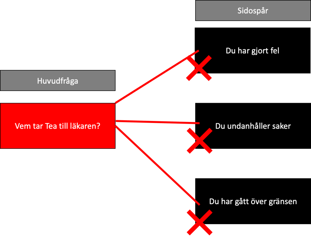 Den narcissistiska föräldern besvarar inte frågan som ställs. Istället kastar narcissisten i det här exemplet ut lockbeten till tre potentiella sidospår.