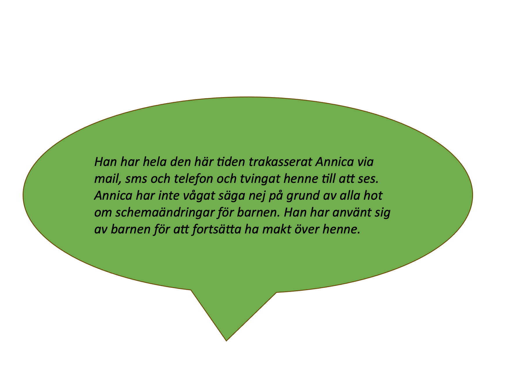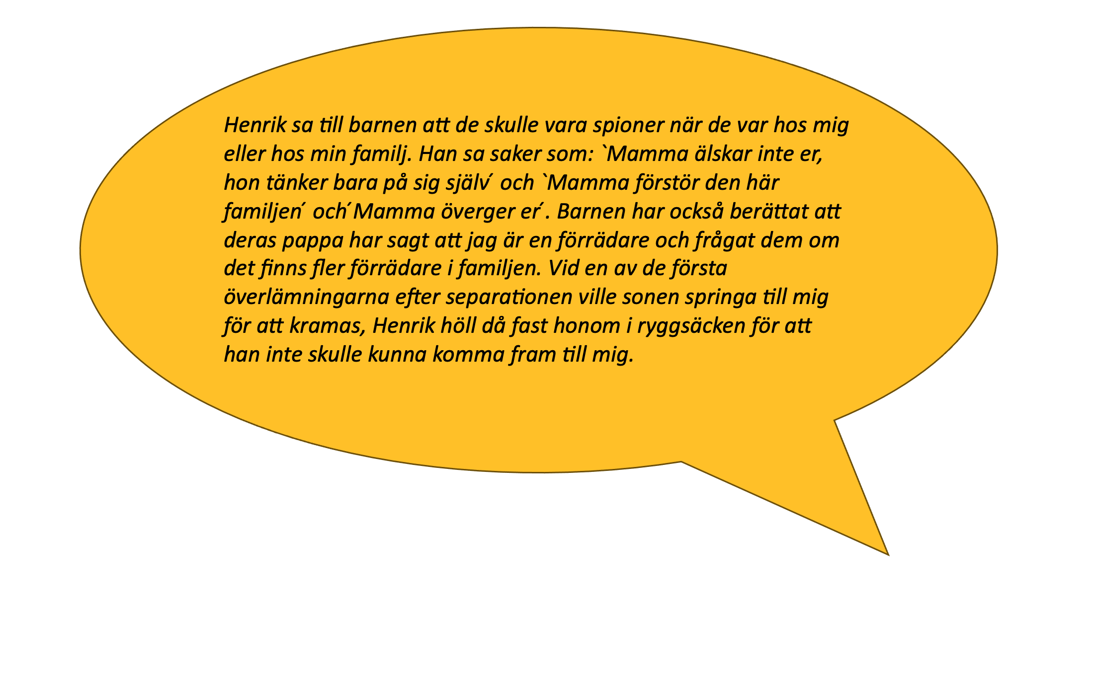 Det här är två citat från ”Erik” och ”Emma” som jag intervjuade i boken Resan ur den destruktiva relationen. De har levt i destruktiva relationer och har barn med sina före detta partners, för dem fortsatte våldet efter att relationerna tog slut. ”Monica” som också blir intervjuad i boken och som stöttade sin dotter Annica när hon levde i och lämnade en destruktiv relation uttrycker sig såhär:
